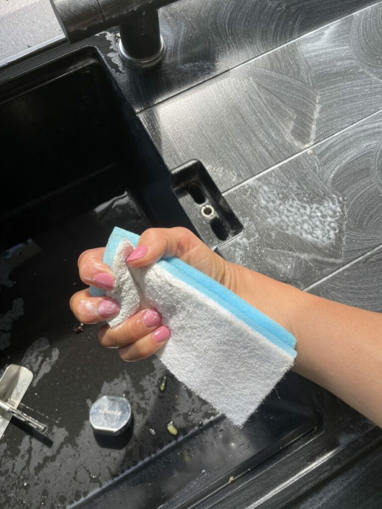 Alle Mamis da draußen wissen, das man deutlich mehr Zeit in der Küche verbringt, wenn man einen Säugling versorgen muss. Ich koche täglich, spüle mehr Mals am Tag die Milchfläschchen aus und spüle viele Küchenutensilien von Hand ab. All das machen meine Nägel ohne Probleme mit.